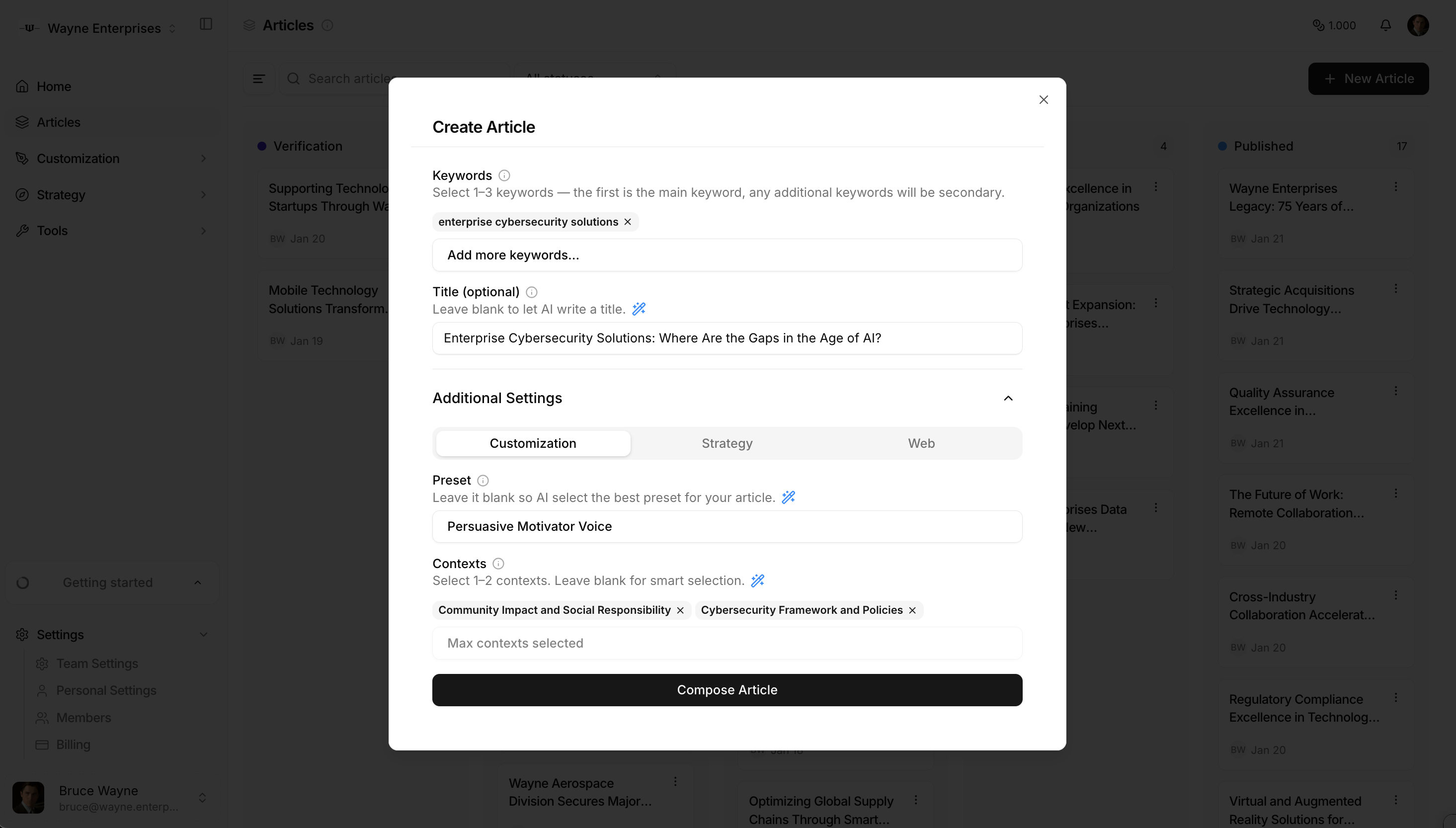Enter your keywords, hit 'Compose,' and watch AI craft articles that sound human-written and rank on Google. No prompts, no hassle — just results.